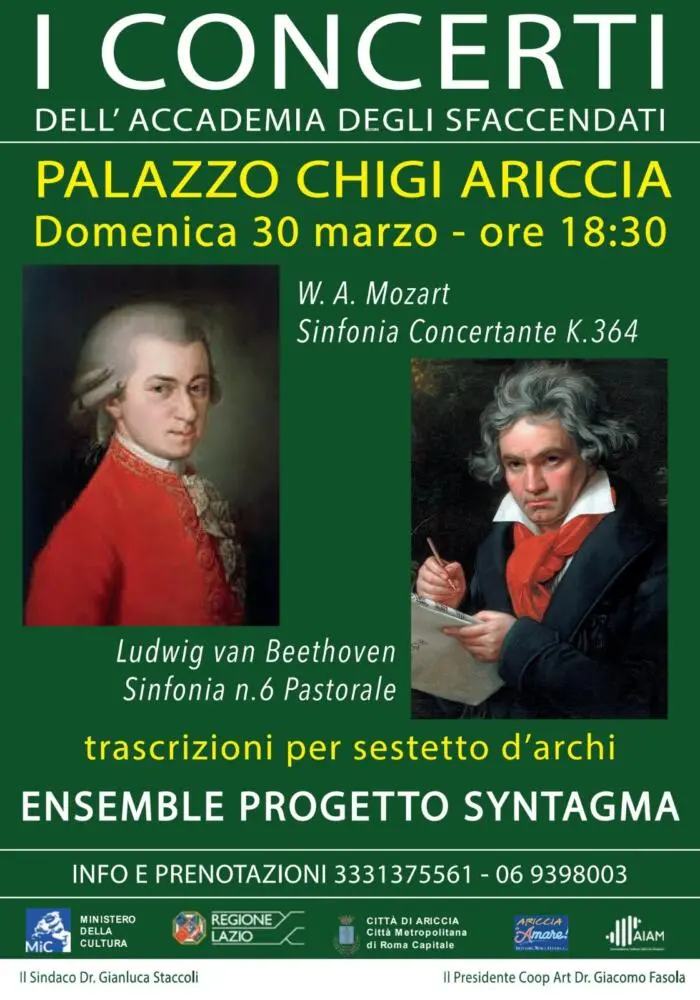 Domenica 30 marzo, alle ore 18:30, concerto d’apertura della Stagione 2025 de “I Concerti dell’Accademia degli Sfaccendati” nella Sala Maestra di Palazzo Chigi ad Ariccia. Per questo nuovo inizio l’Ensemble Progetto Syntagma con un organico formato da 2 violini, 2 viole e 2 violoncelli proporrà le trascrizioni ottocentesche di due capolavori assoluti della storia della musica: la Sinfonia Concertante per violino, viola e orchestra K364 di Mozart e la Sinfonia n.6 “Pastorale” di Beethoven.