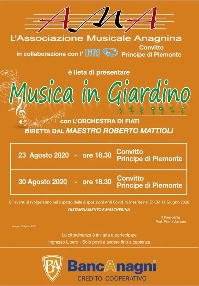 L’Orchestra di Fiati dell’Associazione Musicale Anagnina, diretta dal Maestro Roberto Mattioli, vi aspetta anche quest’anno con la ormai tradizionale rassegna estiva ‘Musica in Giardino‘ il 23 e il 30 Agosto, alle ore 18.30, presso i giardini del Convitto Principe di Piemonte di Anagni.