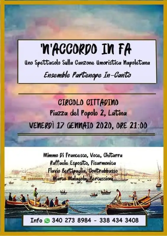Venerdì 17 gennaio alle ore 21.00 presso il Circolo Cittadino di Latina l’Ensemble Partenope In-Canto si esibirà nello spettacolo N’Accordo in Fa sulla canzone umoristica napoletana.