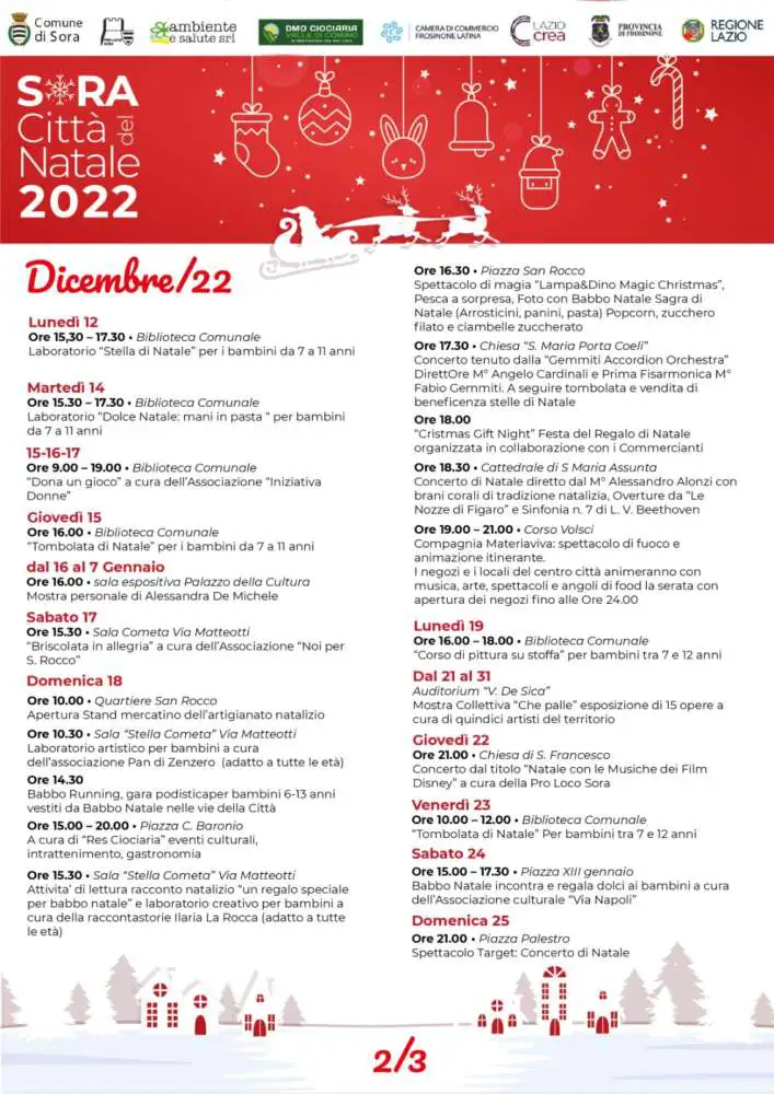 Dall’8 Dicembre all’6 Gennaio 2023 Sora Città del Natale 2022 tutti gli appuntamenti del Natale a Sora. Un calendario ricco di eventi per bambini ed adulti: musica, spettacoli, luminarie e divertimento per passare serenamente il Natale....