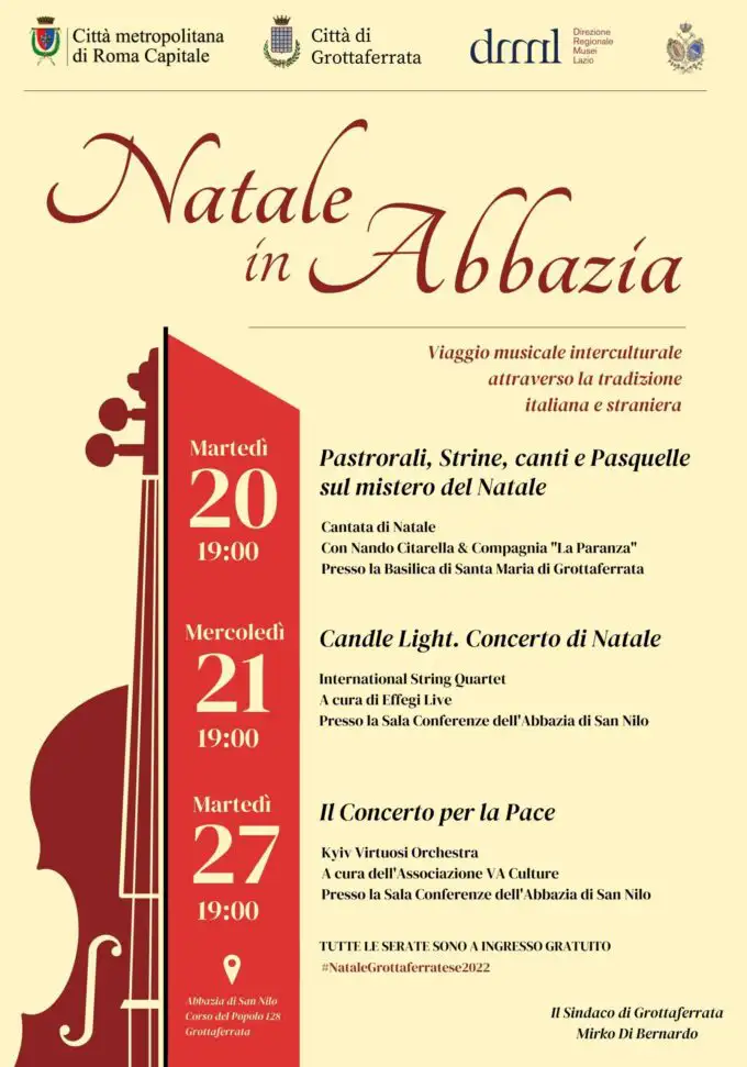 “Grazie alla convenzione firmata con la Direzione Musei Lazio e la Congregazione dei monaci basiliani – spiega il Sindaco Mirko Di Bernardo – abbiamo proposto lo svolgimento di questi tre concerti, facenti parte della rassegna natalizia, all’interno degli spazi abbaziali. Tre eventi finanziati con il contributo della Città Metropolitana di Roma, con cui la collaborazione è sempre proficua ed efficace. l’Abbazia di San Nilo, centro identitario di Grottaferrata, torna così ad essere un polo culturale d’eccezione in grado di attrarre manifestazioni di caratura nazionale e internazionale”.