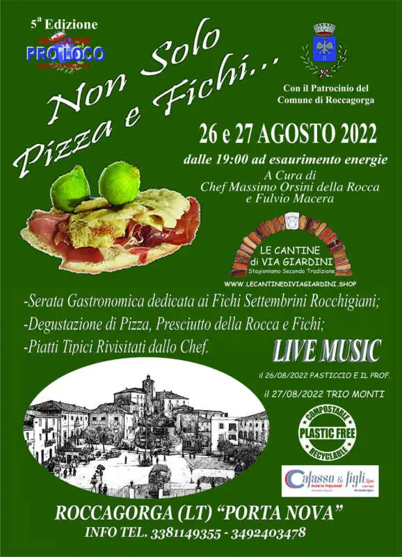 Non solo pizza e fichi a Roccagorga, l’evento enogastronomico giunto alla quarta edizione, si svolgerà venerdì 23 e sabato 24 agosto a partire dalle 19 a “Porta nova” nel cuore del centro storico. Questi due alimenti, solitamente screditati con la classica espressione “mica pizza e fichi” usata a confronto per valorizzare qualcos’altro, a Roccagorga non solo verranno valorizzati ma saranno un pretesto per valorizzare anche altri prodotti tipici dei paesi monti lepini.