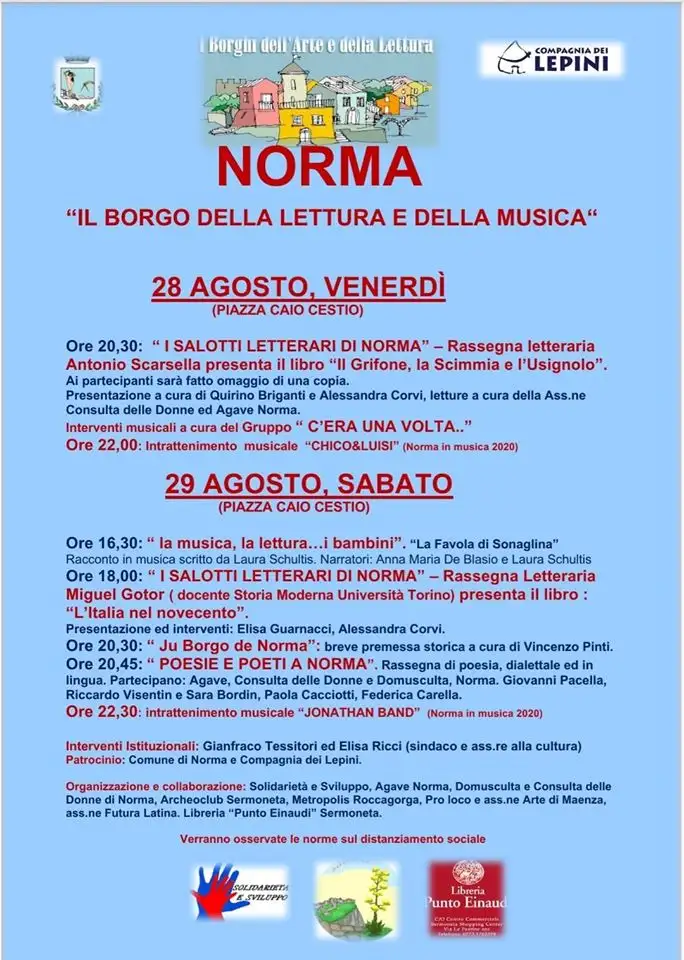 "Perché l'acqua, le parole e le note dissetano il corpo e l'anima di ognuno di noi, appartengono a tutti e non hanno differenza d'età...". 28 e 29 agosto 2020, piazza Caio Cestio NORMA: IL BORGO ANTICO DOVE LE PAROLE E LA MUSICA SI RINCORRONO....