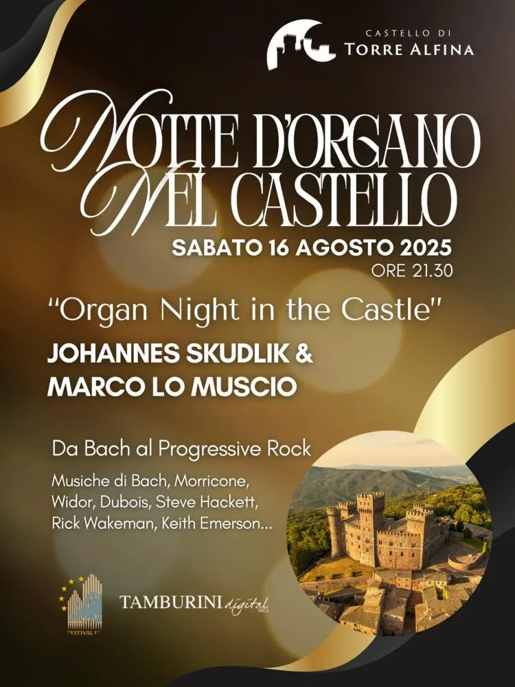 PRESENTAZIONE: Una serata musicale magica e speciale nel Castello di Torre Alfina con la grande musica per organo eseguita da due musicisti internazionali: Il M° Marco Lo Muscio organista, pianista e compositore con più di 900 concerti all’attivo in alcune delle sale e cattedrali più rinomate, da Notre Dame a Parigi al castello dei Windsor, nonchè collaboratore italiano di Steve Hackett dei Genesis e dell’università di Harvard! Il M° Johannes Skudlik dalla Germania, Direttore d’orchestra, organista e pianista con migliaia di concerti all’attivo nei luoghi più famosi come la Filarmonica di Berlino o la Sagrada Familia a Barcellona! Il Programma partirà da celebri composizioni organistiche di Bach per poi passare a grandi autori Francesi ed arrivare a colonne sonore di Morricone e celebri pagine dal repertorio Progressive Rock con speciali arrangiamenti per organo.