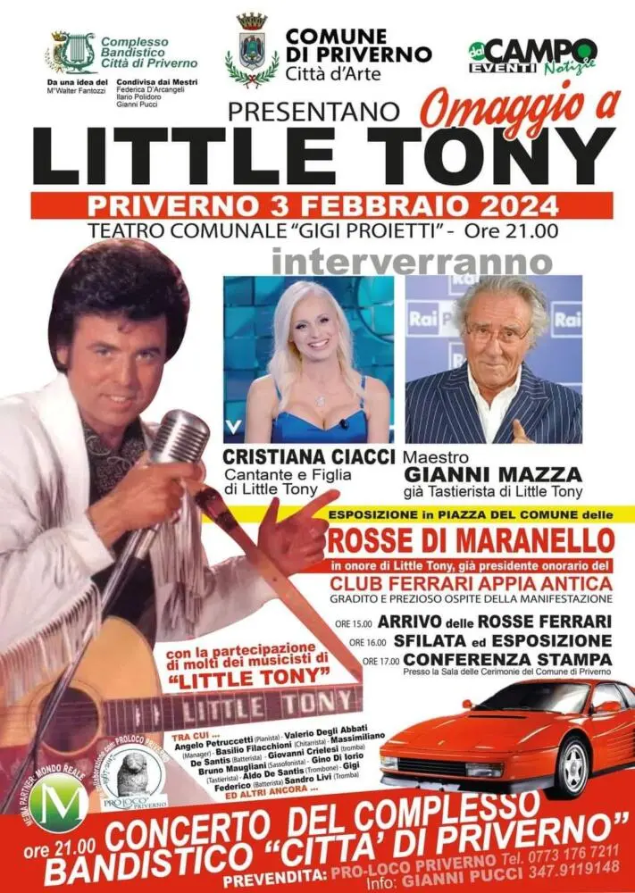 Il programma della giornata prevede, alle ore 15.00, l’arrivo delle Ferrari in Piazza Giovanni XXIII; alle ore 16,00, l’esposizione e la sfilata delle Rosse di Maranello per le vie della città; alle ore 17.00, una conferenza stampa di presentazione e alle ore 21.00, il grande concerto “OMAGGIO A LITTLE TONY”, curato dal Complesso Bandistico Città di Priverno e diretto dalla Maestra Federica D’Arcangeli, affiancata per l’occasione dal direttore artistico, Maestro Walter Fantozzi, oltre che dai Maestri Ilario Polidoro e Gianni Pucci.