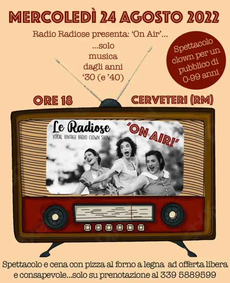 Visto il grande successo delle altre serate, vi proponiamo ancora uno Spettacolo con a seguire Pizza al forno a legna per tutti; sempre con la formula ad offerta libera nella nostra campagna a Cerveteri, a ridosso del parco giochi, spazio che accoglie grandi e piccini: Mercoledì 24 agosto: Radio Radiose – solo musica dagli anni ’30 (e ’40!) è una radio da teatro o da strada, da giardino o addirittura da salotto… ma soprattutto è una radio che trasmette solo, esclusivamente in diretta!