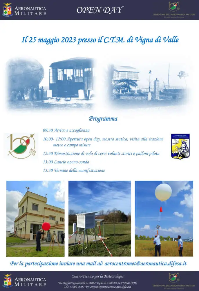 Open day al Centro Tecnico per la Meterologia di Vigna di Valle Programma – 09:30 Arrivo e accoglienza – 10:00- 12:00 Apertura open day, mostra statica, visita alla stazione meteo e campo misure 2023 – 12:30 Dimostrazione di volo di cervi volanti storici e palloni pilota – 13:00 Lancio ozono-sonda – 13:30 Termine della manifestazione [...]...