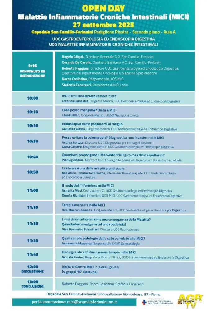 Il 27 settembre 2025 l’Ospedale San Camillo-Forlanini di Roma organizza un Open Day dedicato alle Malattie Infiammatorie Croniche Intestinali (MICI). L’evento si terrà presso il Padiglione Piastra – Secondo piano, Aula A, e sarà un’occasione unica per approfondire le conoscenze su diagnosi, terapie e gestione quotidiana delle MICI.