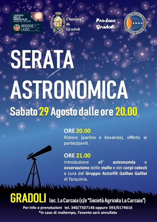 Appuntamento il 29 agosto 2020 a Gradoli in località La Carcaia per la serata astronomica organizzata dal comune e dalla pro loco di Gradoli insieme al Gruppo astrofili Galileo Galilei (GrAG) di Tarquinia.