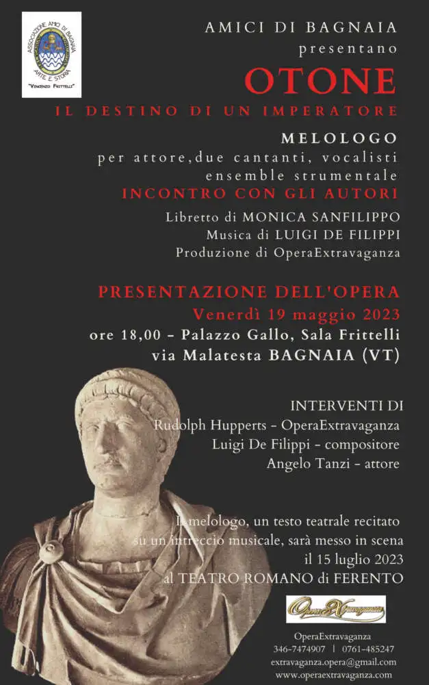 Venerdì 19 maggio alle ore 18,00, nella sala Frittelli di Palazzo Gallo a Bagnaia, sarà presentato il melologo “Otone – il destino di un imperatore” che andrà in scena il prossimo 15 luglio al teatro romano di Ferento.