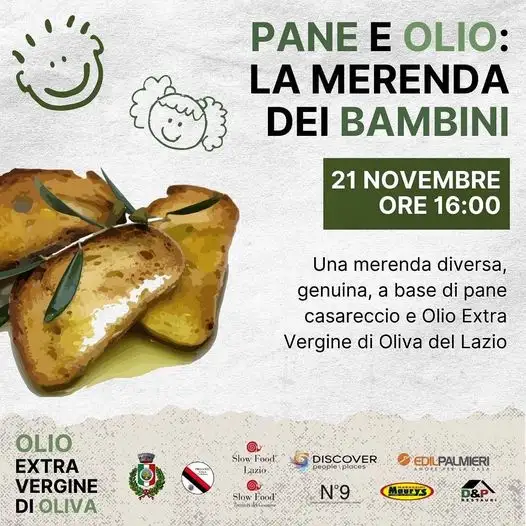Alle 16:00 una merenda dedicata ai più piccoli, fatta di pochi ma deliziosi ingredienti: il pane casareccio e l’olio locale dei nostri produttori.