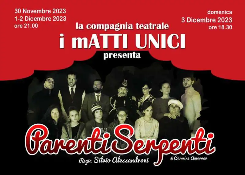 Dopo la lunga pausa del Covid i mATTI UNICI tornano in scena con “Parenti Serpenti” giovedì 30 novembre ore 21.00, venerdì 1° dicembre ore 21.00, sabato 2 dicembre ore 21.00 e domenica 3 dicembre ore 18.30.
