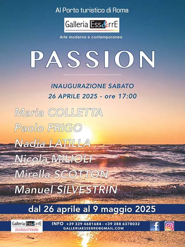 Al Porto turistico di Roma, con le imbarcazioni che contornano la proposta culturale e gli splendidi tramonti laziali, la mostra “PASSION”, con sei artisti selezionati per l’occasione, sarà l’occasione per una passeggiata al Porto, per visitare la mostra e per godere delle bellezze culturali che Ostia detiene, prima fra tutte gli Scavi di Ostia Antica e immediatamente a ridosso della Galleria Ess&rrE, Tor San Michele, una torre del 1500 edificata su progetto di Michelangelo Buonarroti. Vi aspettiamo insieme agli artisti, Maria Colletta, Paolo Frigo, Nadia Latilla, Nicola Milioli, Mirella Scotton e Manuel Silvestrin per un aperitivo e le telecamere di Antonello Nazarini per ZTL TV per immortalare i momenti più esaltanti dell’inaugurazione.