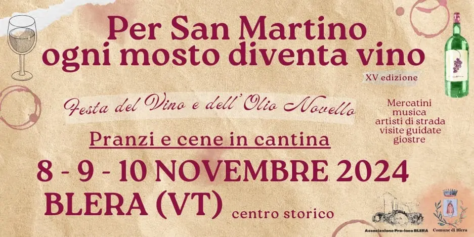 La manifestazione “PER SAN MARTINO OGNI MOSTO DIVENTA VINO” si svolgerà, come ogni anno, nel fine settimana di S.Martino nel centro storico di Blera.