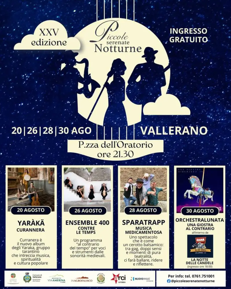 Nel cuore della Tuscia Viterbese torna anche quest’anno l’attesissimo appuntamento con Piccole Serenate Notturne, la rassegna musicale organizzata dall’Assessorato alla Cultura del Comune di Vallerano, giunta alla sua venticinquesima edizione. Un traguardo importante che celebra un quarto di secolo di musica, incontro e valorizzazione culturale. Come da tradizione, i concerti si svolgeranno in Piazza dell’Oratorio, alle ore 21:30, con ingresso gratuito, in un contesto intimo e suggestivo che da sempre contraddistingue l’anima della manifestazione.