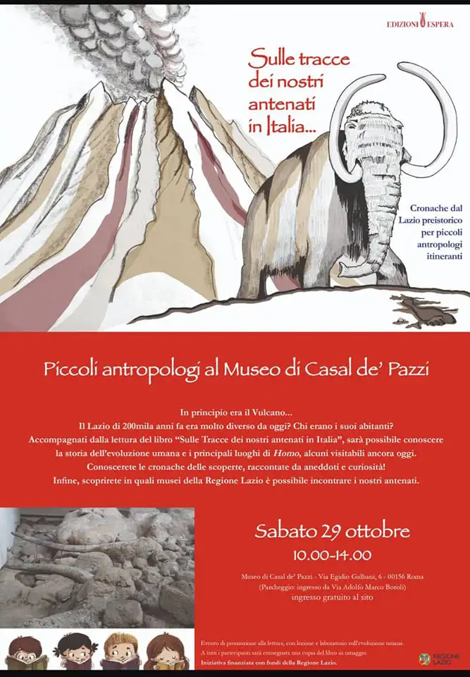 Nell’ambito di un evento di promozione alla lettura verrà presentato il volume “Sulle tracce dei nostri antenati in Italia” edito da Edizioni Espera, nato dal progetto divulgativo degli antropologi F.Salomone, L.Bellucci e G.Manzi e finalizzato a illustrare le appassionanti vicende dell’evoluzione umana a un pubblico di bambini e ragazzi in età scolare.