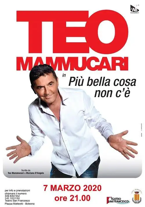 Il primo a calcare le scene, il 7 marzo alle 21, sarà Mammucari, con “Più bella cosa non c’è”. Il noto presentatore propone un monologo dove può finalmente parlare liberamente, sempre con il suo cinismo, di amore, della gioia di essere diventato padre e della speranza di uscire dalle regole sociali imposte; di quello che è accaduto, sta accadendo e probabilmente accadrà nel suo mondo.