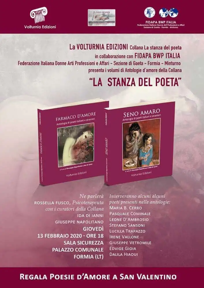 Parleranno d’amore, e di poesia d’amore, i curatori della collana “la stanza del poeta” Ida Di Ianni e Giuseppe Napolitano insieme alla poetessa e psicoterapeuta Rossella Fusco. “Farmaco d’amore” e “Seno amaro” i titoli delle due antologie, che raccolgono 37 poeti italiani e stranieri, voci diverse, temi diversi ma un solo obiettivo: cantare l’amore, forza vitale e dono bellissimo da condividere.