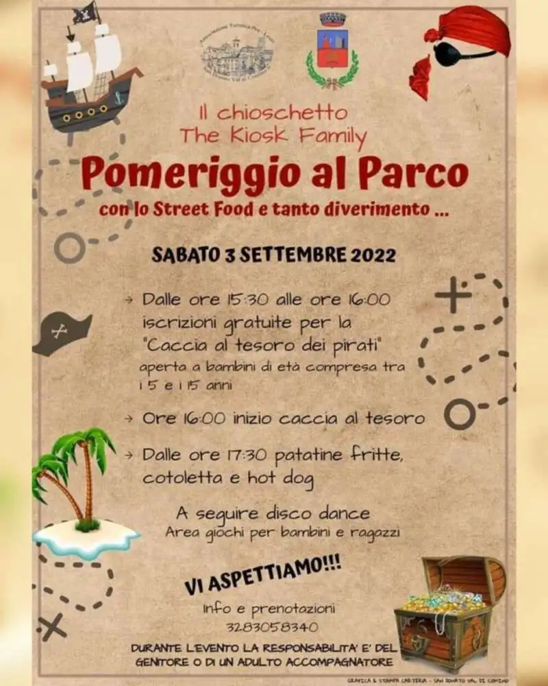 Pomeriggio al Parco con lo Street Food e tanto divertimento… presso il Chioschetto Dalle ore 15:30 alle ore 16:00 Iscrizioni gratuite per la “Caccia al tesoro dei pirati” aperta a bambini di età compresa tra i 5 e i 15 anni Ore 16:00: inizio caccia al tesoro Dalle ore 17:30: patatine fritte, cotoletta e hot [...]...