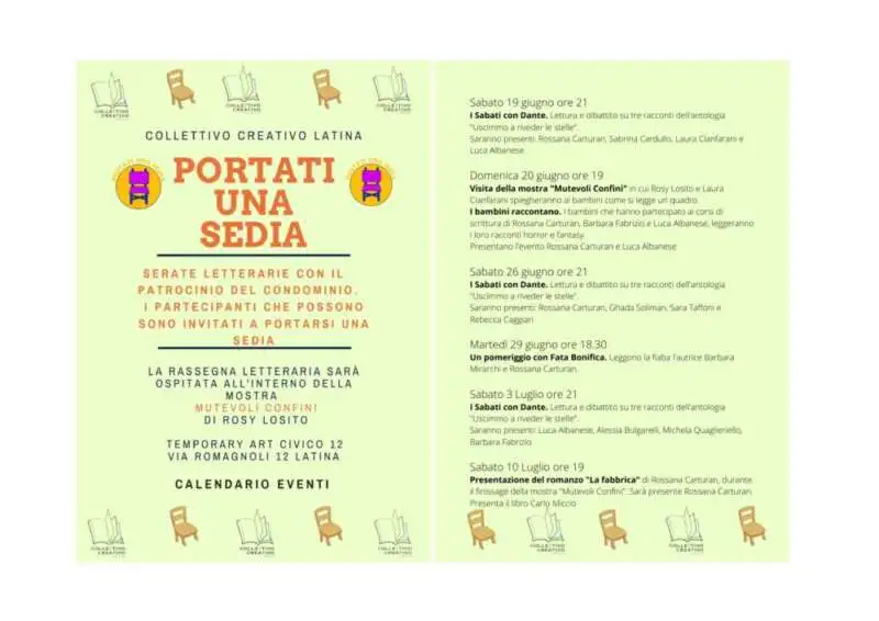 Da sabato 19 giugno a domenica 10 luglio p.v. Il Collettivo Creativo Latina ospite della mostra “Mutevoli Confini” dell’artista Rosy Losito, Temporary art civico 12 – Via Romagnoli 12 – organizza una rassegna letteraria per adulti e ragazzi .