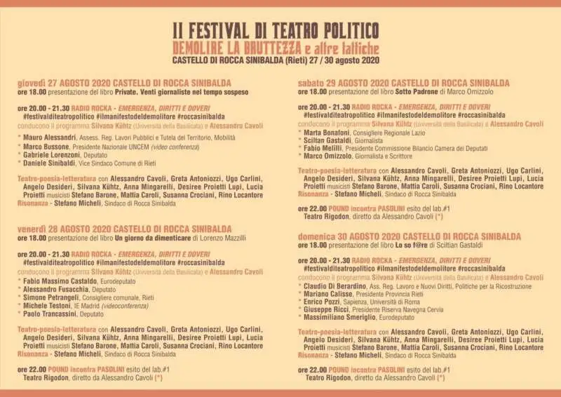 “Pound incontra Pasolini” lo spettacolo teatrale portato in scena per tre serate nella cornice del castello di Rocca Sinibalda dal Teatro Rigodon per la regia di Alessandro Cavoli è stato un successo. Si replica questo fine settimana, sempre alle 22, nella corte del castello, con prenotazione obbligatoria, dal 28 al 30 agosto.