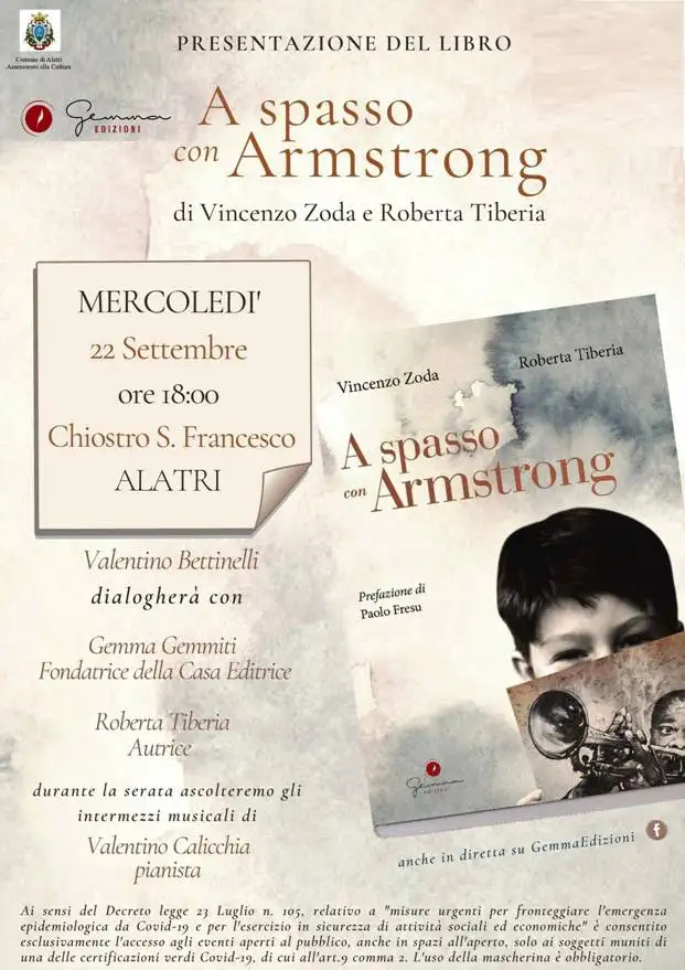Ad Alatri (Fr) mercoledì 22 settembre 2021 alle ore 18.00 presso il Chiostro di San Francesco presentazione del libro “A spasso con Armstrong” di Vincenzo Zoda e Roberta Tiberia.