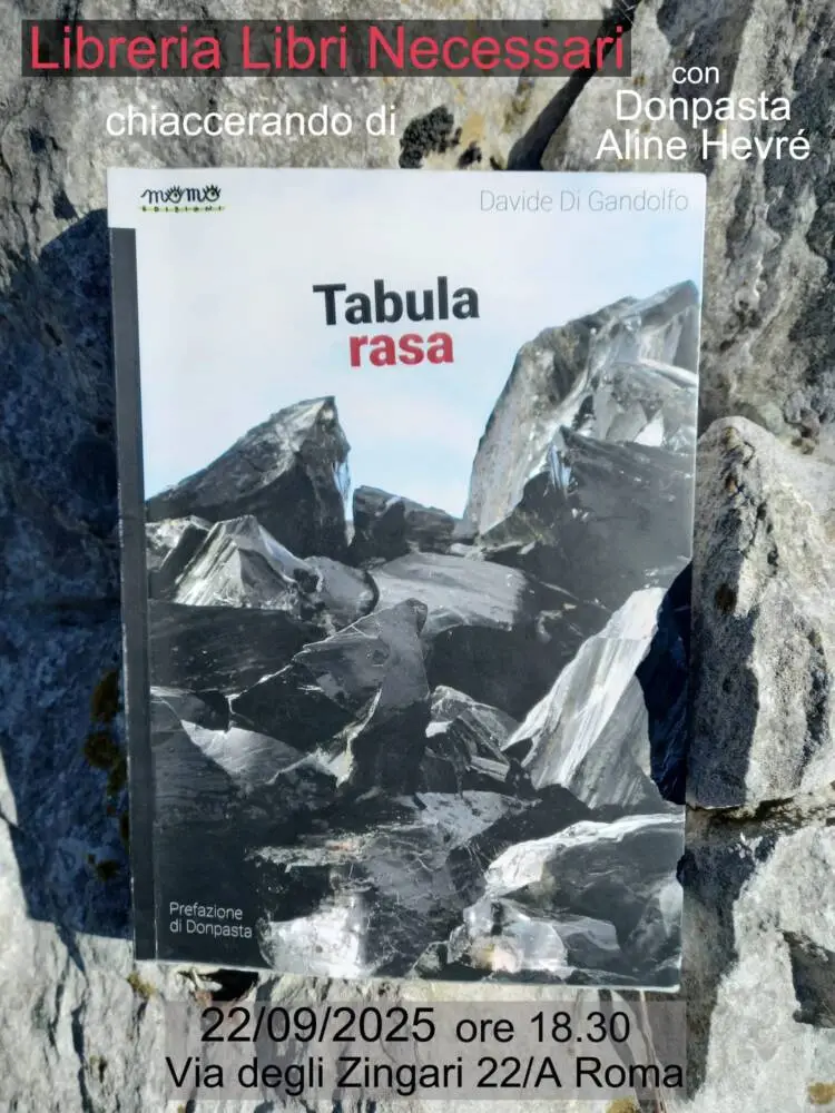 Lunedi 22 settembre chiacchierata sul romanzo “Tabula rasa” di Davide Di Gandolfo, all’interno del festival NaturalMonti, insieme a Daniele de Michele e Aline Hervé. A seguire in piazza degli Zingari, Studio Cliche e Donpasta Selecter, racconteranno in suoni ed immagini il libro, con loro il live di Jardel....
