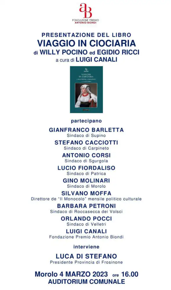 Sabato 4 Marzo 2023 alle ore 16:00 presso l’Auditorium Comunale ci sarà la presentazione del libro Viaggio in Ciociaria di Willy Pocino ed Egidio Ricci a cura di Luigi Canali.