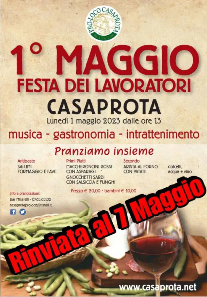 Il Primo Maggio a Casaprota vi aspetta la Festa dei Lavoratori con musica, gastronomia e intrattenimento….. non dimenticate di prenotare entro il 28 Aprile. Purtroppo viste le previsioni del tempo per lunedì Primo Maggio l’evento è stato rinviato a Domenica 7...