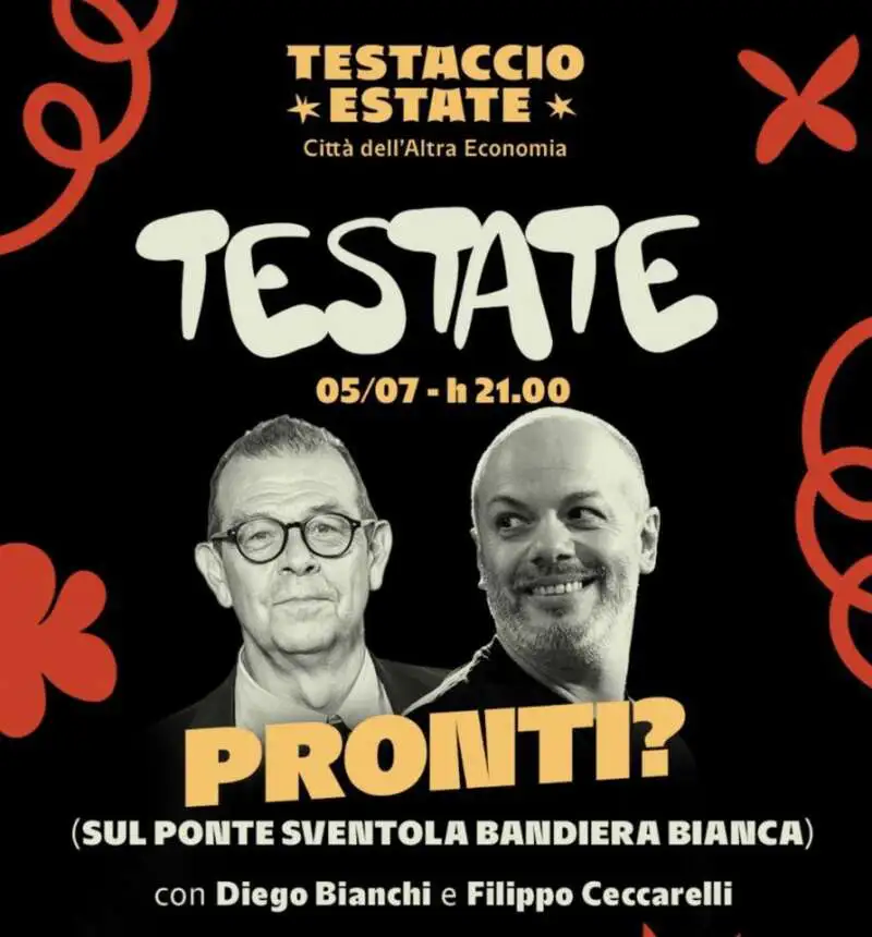 Mercoledì 5 Luglio H. 21.00 PRONTI? (Sul ponte sventola bandiera bianca) Erano “Pronti” e le elezioni le hanno vinte, ora gli tocca governare. Dalla mano pesante alla scomparsa di Berlusconi, la stagione politica del governo Meloni (ma non solo) nel dialogo tra Filippo Ceccarelli e Diego Bianchi. Testaccio Estate Città dell’Altra Economia – CAE...