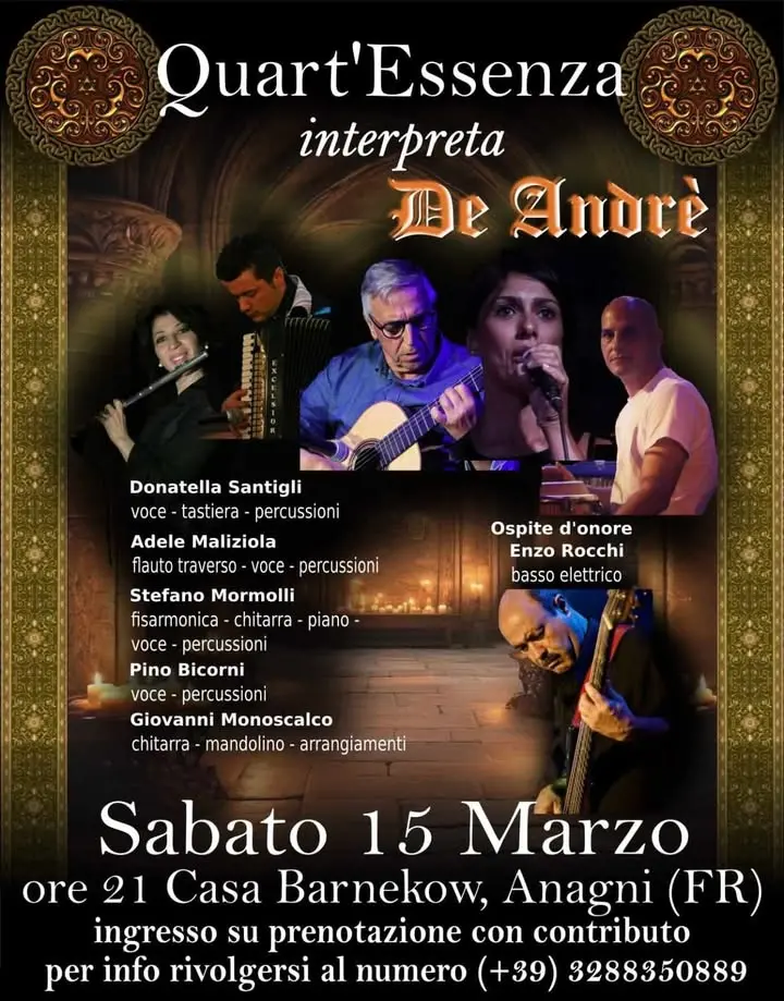 Dopo il grande successo di gennaio, a grande richiesta, sabato 15 marzo, alle ore 21:00, viene replicato a Casa Barnekow (Anagni Frosinone) il concerto “QUART’ESSENZA INTERPRETA DE ANDRÈ”