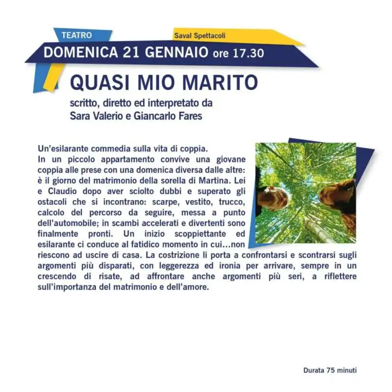 Lei e Claudio dopo aver sciolto dubbi e superato gli ostacoli che si incontrano: scarpe, vestito, trucco, calcolo del percorso da seguire, messa a punto dell’automobile; in scambi accelerati e divertenti sono finalmente pronti. Un inizio scoppiettante ed esilarante ci conduce al fatidico momento in cui…non riescono ad uscire di casa. La costrizione li porta a confrontarsi e scontrarsi sugli argomenti più disparati, con leggerezza ed ironia per arrivare, sempre in un crescendo di risate, ad affrontare anche argomenti più seri, a riflettere sull’importanza del matrimonio e dell’amore.