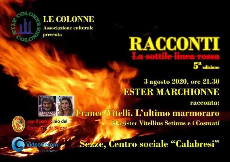 Il 3 Agosto 2020 alle ore 21:30 si terrà presso il Centro sociale Calabresi uno spettacolo con la partecipazione di Ester Marchionne che racconterà Franco Vitelli. L’ultimo marmoraro, Magister Vitellius Setinus e i Cosmati.