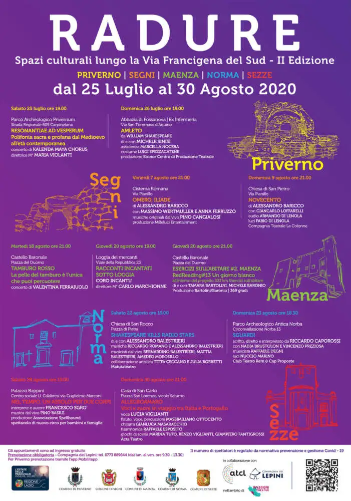 Radure: Spazi culturali lungo la Via Francigena del Sud è un festival di valorizzazione del patrimonio culturale del sistema territoriale dei Monti Lepini a cura dei Comuni di Priverno, Segni, Maenza, Norma, Sezze, in collaborazione con ATCL e Compagnia dei Lepini.