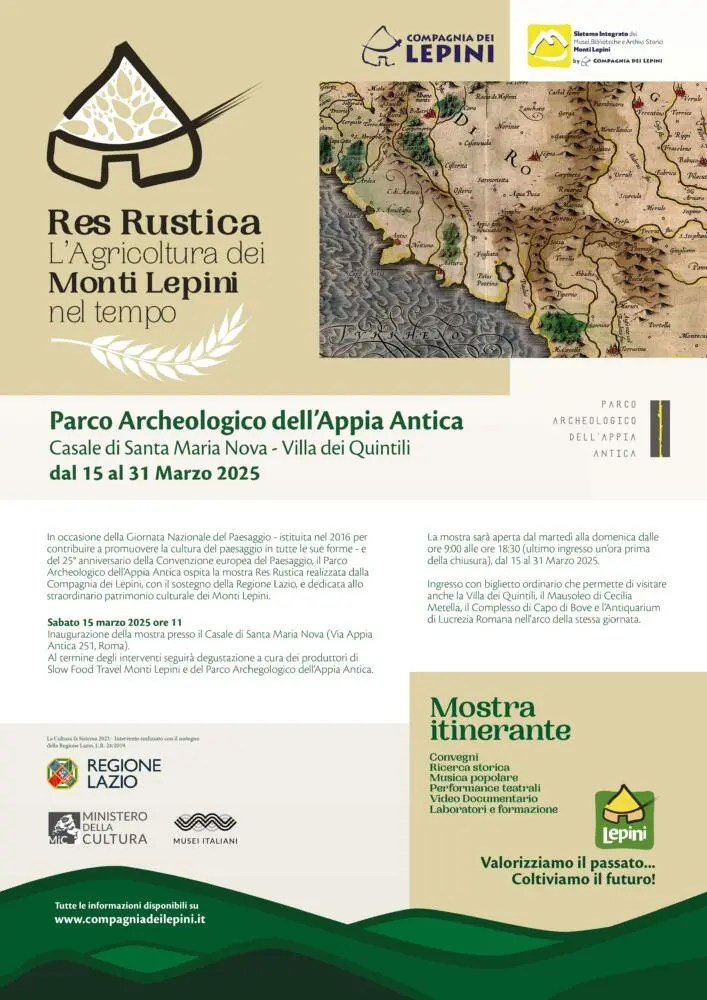In occasione della Giornata Nazionale del Paesaggio e del 25° anniversario della Convenzione Europea del Paesaggio, dal 15 al 31 marzo il Parco Archeologico dell’Appia Antica ospiterà all’interno della suggestiva sede del Casale di Santa Maria Nova la mostra Res Rustica: l’Agricoltura dei Monti Lepini nel tempo, un progetto realizzato dalla Compagnia dei Lepini con il sostegno della Regione Lazio, che mira a valorizzare il ricco patrimonio culturale, agricolo e storico dei Monti Lepini, ponendolo in connessione con il percorso dell’Appia Antica, recentemente riconosciuta nella lista del Patrimonio Mondiale dell’UNESCO.