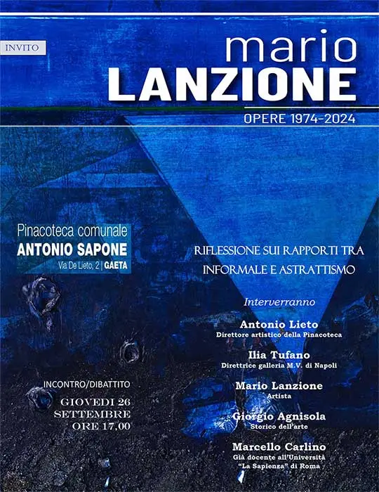 Incontro/dibattito: RIFLESSIONE SUI RAPPORTI TRA INFORMALE E ASTRATTISMO che si terrà, nell’ambito della mostra “Mario Lanzione. Opere 1974/2024” alle ore 17,00 di giovedì 26 settembre 2024, presso la Pinacoteca Comunale “A.Sapone”, via De Lieto 2/4, Gaeta (Lt).