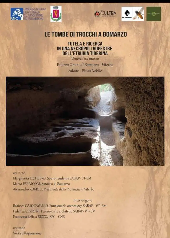 Sarà anche l’occasione per mostrare in anteprima i reperti rinvenuti durante gli scavi con l’esposizione “Le Tombe di Trocchi a Bomarzo. Una necropoli rupestre nell’Etruria tiberina”. All’evento saranno presenti Margherita Eichberg, soprintendente Sabap-Vt-Em, Marco Perniconi, Sindaco di Bomarzo e Alessandro Romoli, Presidente della Provincia di Viterbo e interverranno Beatrice Casocavallo, funzionario archeologo Sabap-Vt-Em, Federica Cerroni, funzionario architetto Sabap-Vt-Em e Francesca Letizia Rizzo, Ispc-Cnr.