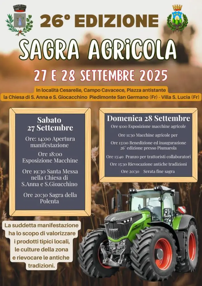 Torna uno degli appuntamenti più attesi e partecipati del territorio: la Sagra Agricola, giunta quest’anno alla sua 26ª edizione, si svolgerà nei giorni sabato 27 e domenica 28 settembre 2025 in località Cesarelle – Campo Cavaccece, presso la piazza antistante la Chiesa di Sant’Anna e San Gioacchino, tra Piedimonte San Germano e Villa Santa Lucia.