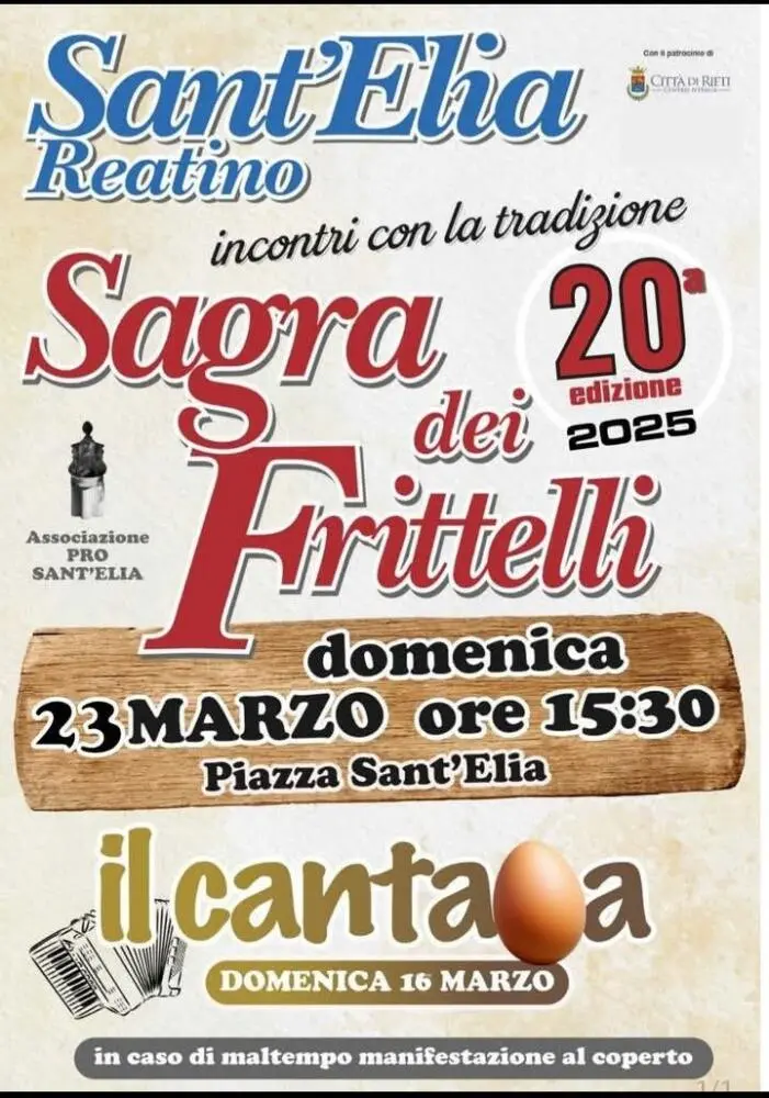 Il 23 marzo a Sant’Elia reatino, dalle ore 15:30 presso la PIAZZA del paese, potrete trovare del buon cibo, vino e musica con la Sagra dei Frittelli