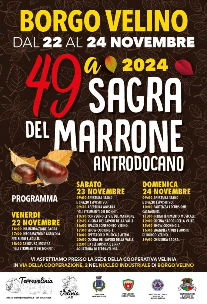 Dal 22 al 24 novembre si terrà a Borgo Velino la sagra del Marrone Antrodocano, per allietare la giornata è farvi godere l’intera giornata in compagnia dei piatti preparati dai comuni del conferimento a base di marroni che vi accompagnerà lungo il percorso degli stand gastronomici insieme alla distribuzione di caldarroste, i giochi di bandiera Degli Sbandieratori di Borgo Velino e musica itinerante fino a sera.