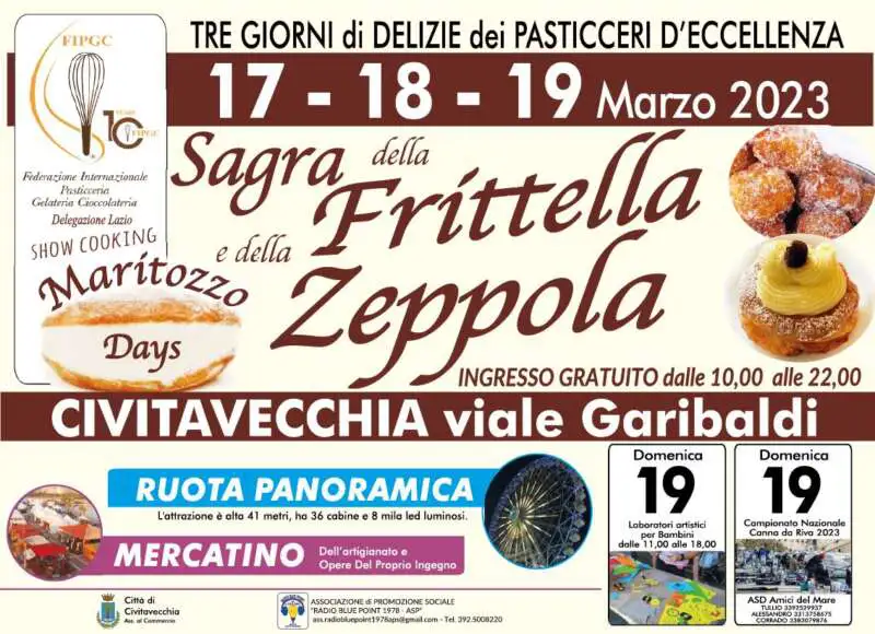 L’ASSOCIAZIONE di PROMOZIONE LOCALE “RADIO BLUE POINT 1978 ASP ” con la presenza della FEDERAZIONE INTERNAZIONALE PASTICCERIA GELATERIA CIOCCOLATERIA delegazione LAZIO ed il COMUNE di CIVITAVECCHIA ass. COMMERCIO, organizzano la Sagra della Frittella e della Zeppola per il 17-18-19 marzo 2023 a Civitavecchia Viale Garibaldi.