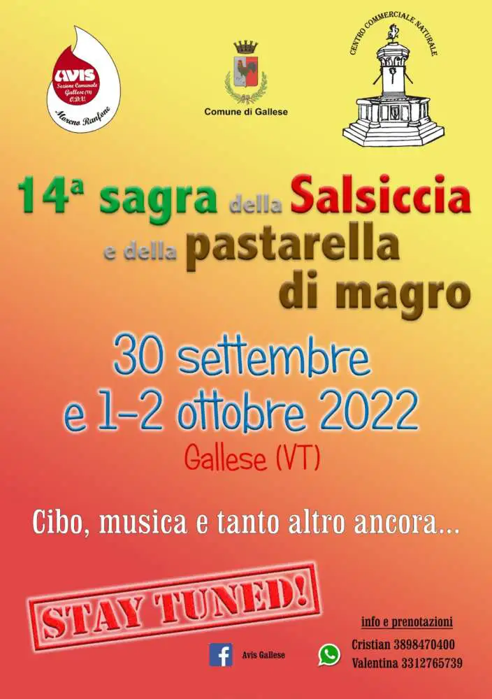 giunge alla quattordicesima edizione, organizzata dal Centro Commerciale Naturale di Gallese in collaborazione con la sezione locale dell’AVIS, nelle giornate di venerdì 30 settembre, sabato 1 ottobre e domenica 29 ottobre 2022.