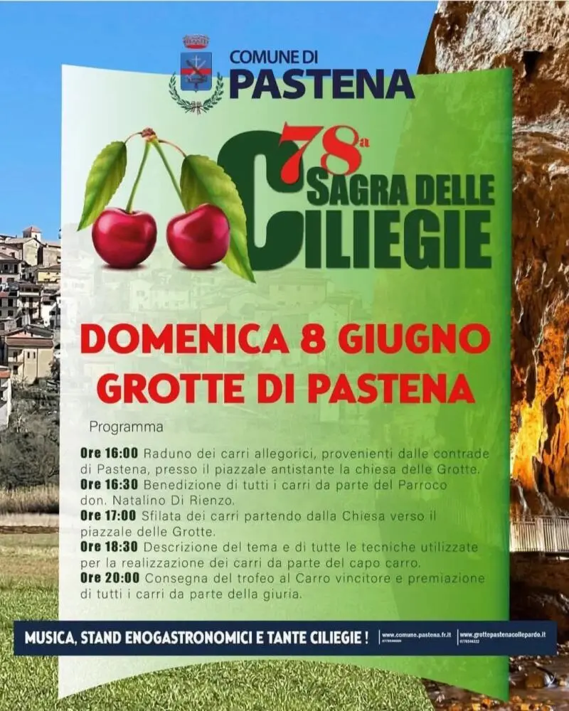 Domenica 8 giugno 2025 si svolge la 78^ edizione della Sagra delle Ciliegie, un evento apprezzato da molti che ogni anno si recano a Pastena per vedere i carri allegorici e gustare le ciliegie.
