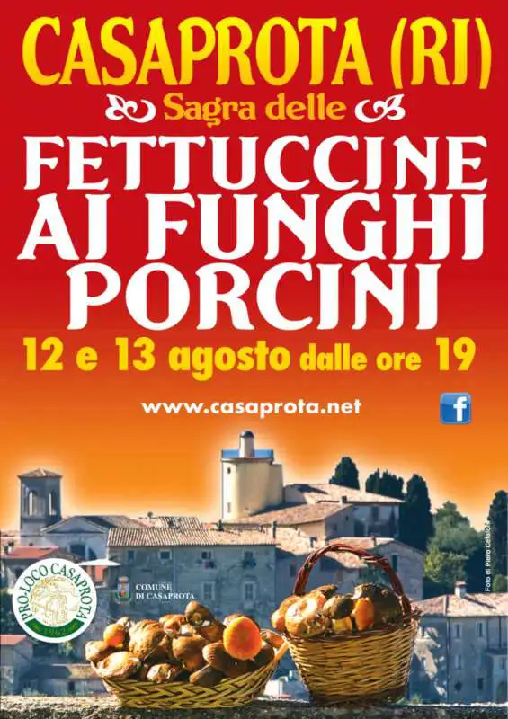 Lo stand gastronomico aprirà alle 19 e, insieme alle fettuccine, saranno proposte tante altre gustose tipicità locali, mentre ogni serata sarà animata da spettacoli musicali dal vivo. La Sagra delle fettuccine ai funghi porcini è la kermesse di punta del “Ferragosto Casaprotano” che sarà inaugurata dal concerto banda musicale Filarmonica Giuseppe Verdi di Casaprota e si articolerà in divertenti giornate all’insegna della musica, dello sport, degli spettacoli e della buona tavola. Giocoleria, arte circense, passeggiate a cavallo, caccia al tesoro e molto altro ancora.