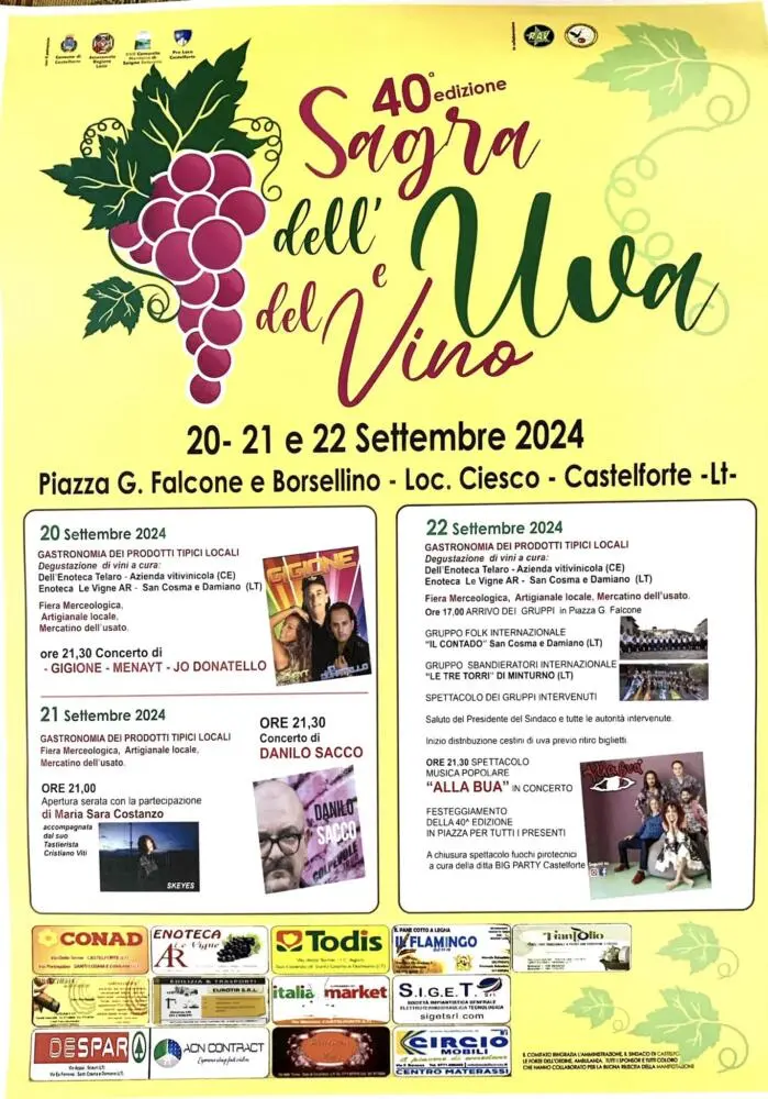 Valori, storia e tradizione, sono le caratteristiche che da sempre contraddistinguono la sagra dell’uva di Castelforte, arrivata ormai alla sue 40esima edizione, e che si svolgerà dal 20 al 22 settembre.