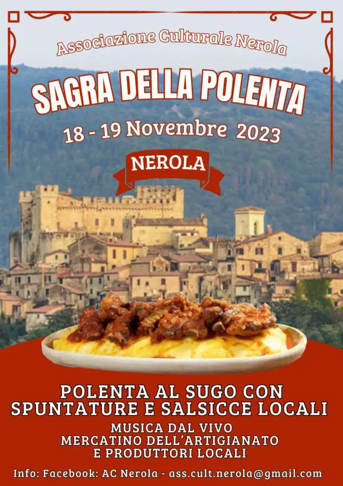 Sabato e domenica 18 e 19 novembre, ad ora di pranzo, si terrà la XIII sagra della polenta organizzata dall’Associazione Culturale Nerola.