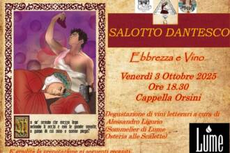 VENERDÌ 3 OTTOBRE ORE 18.30 vi aspettiamo numerosi alla Cappella Orsini (Via di Grotta Pinta, 21): il tema di questo mese, suggerito da Virgilio nel vedere la camminata traballante di Dante, sarà “Ebbrezza e Vino”
