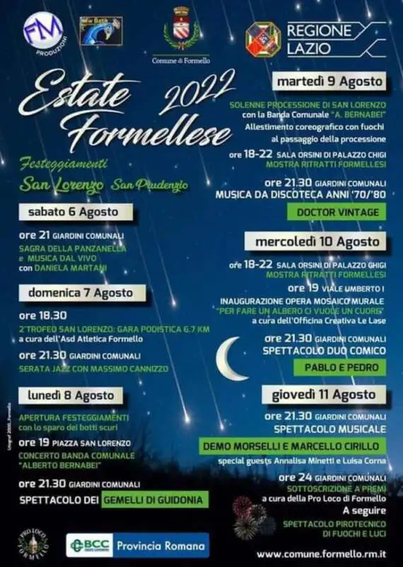Sabato 6 agosto iniziano i festeggiamenti in onore dei nostri Patroni San Lorenzo e San Prudenzio organizzati dal Comune di Formello e la Regione Lazio, in collaborazione con la FM Produzioni e la New Batik.