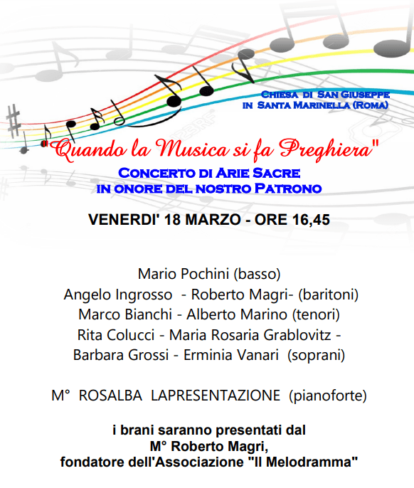 Il secondo concerto, venerdì 18 marzo, con inizio alle 16,45, vedrà invece il ritorno a San Giuseppe dei solisti dell’Associazione Il Melodramma, con un programma vario ed articolato di arie sacre dal suggestivo titolo: “Quando la Musica si fa preghiera”. Potremo ascoltare brani di Rossini, Verdi, Gounod, Haendel, Stradella ed altri autori: : arie celeberrime e mirabilmente interpretate, autentiche preghiere in musica.