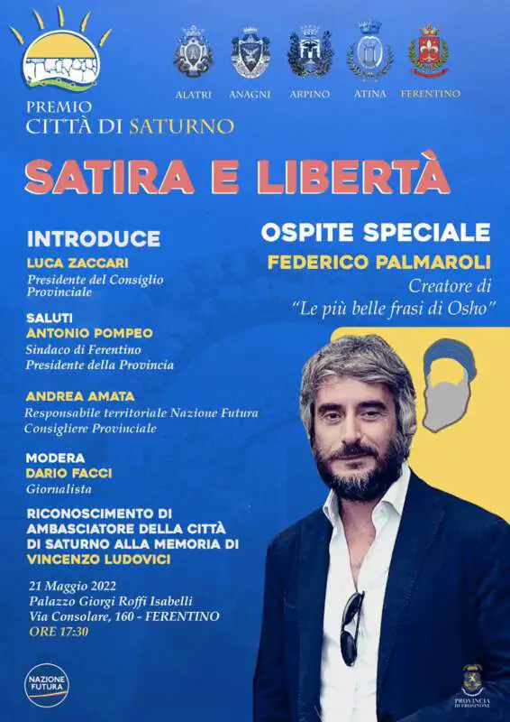 Sabato 21 Maggio, alle ore 17:30, presso lo storico Palazzo Giorgi Roffi Isabelli di Ferentino , prenderà il via il ciclo di cinque appuntamenti promossi dall’associazione Nazione Futura costituenti il premio “Città di Saturno”, un riconoscimento simbolico a una delle personalità che hanno elevato il prestigio del territorio grazie al loro contributo in ambito artistico e professionale.
